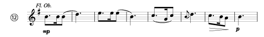 コーダ⑬は2/4だが、3小節周期なので実質は3/2拍子。全楽章で常に主役的に扱われるトランペットが、最後に登場してバトンを受け取る。