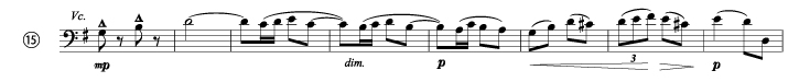 初めてトランペットが最初から主役として登場し、颯爽とファンファーレ⑭を吹奏。派手な序奏が終わるとチェロが主題⑮を奏する。⑮は循環形式的に見た場合、Ⅰ楽章でフルート等が繰り返した②の冒頭Yと関連付けることができる。