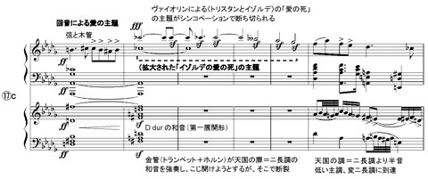 〈9番〉の終楽章では、後半部の頂点121小節~⑰cで、こうした全ての素材が統合される。先ず、回音が拡大・強奏されて愛の成就を予感させ、金管群が、輝かしいニ長調の和音で、それを支える。旋律線は《愛の死》の主題⑰aを拡大したものだが、これを第1楽章のシンコペーションによる⑬が分断することで、決定的な “死の告知” が示される。シューベルト、ブルックナーを継承し、とどめを刺した形だ。