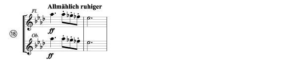 この楽章は様々なキャラクターが入り乱れる。スケルツォ主部の主役⑬ ⑭ ⑮はいずれも活動的。中でも⑮はトゥーランドットの「ピン・ポン・パン」のような道化の3人組として、演技的にも擬人化されている。テンポが緩む中間部は、農民舞曲的なレントラー⑯に転じるが、やがて⑰嘆きの影が差し、言いがかりめいた威嚇⑱も繰り返される。