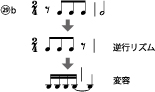 展開部はホルンの (24) をヴァイオリン・ソロが (22) の拡大型が受けた後、切迫気味に坂を登りはじめる。小休止→再始動という歩みの途中で起爆剤的に点火されるのが (29a)。ラフマニノフはチャイコフスキーの〈4~6番〉に倣って〈運命〉主題を巧みに扱うが、(29a) 最下段のヴィオラは、(29b) のように〈運命〉主題を後ろから読んだ逆行リズムになっている。