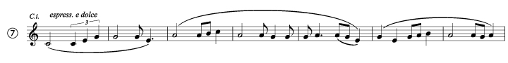 再び5/4拍子に回帰。第2ヴァイオリンが奏するオスティナートリズムの先導で、木管群が祈る⑨。主題を合奏で提示する場合、普通は最上声部が主旋律を担うものだが、ここでは第2・3番フルートとファゴットがメイン。1番フルートは6度音程で和音を埋めるので、レスピーギは[1番Fl・pp][2・3番Fl・mf ][1番Fg・mp]というバランスを指定。この後⑨が楽器を変えて再現される際も同様で、この楽章の特徴となっている。