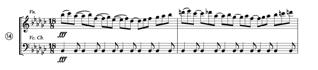 弦が新たに導入した⑬がクレッシェンドして⑭による頂点が築かれた後、オケの大音響と交替して〈サンクトゥス〉の原型⑫bでオルガンが参入。